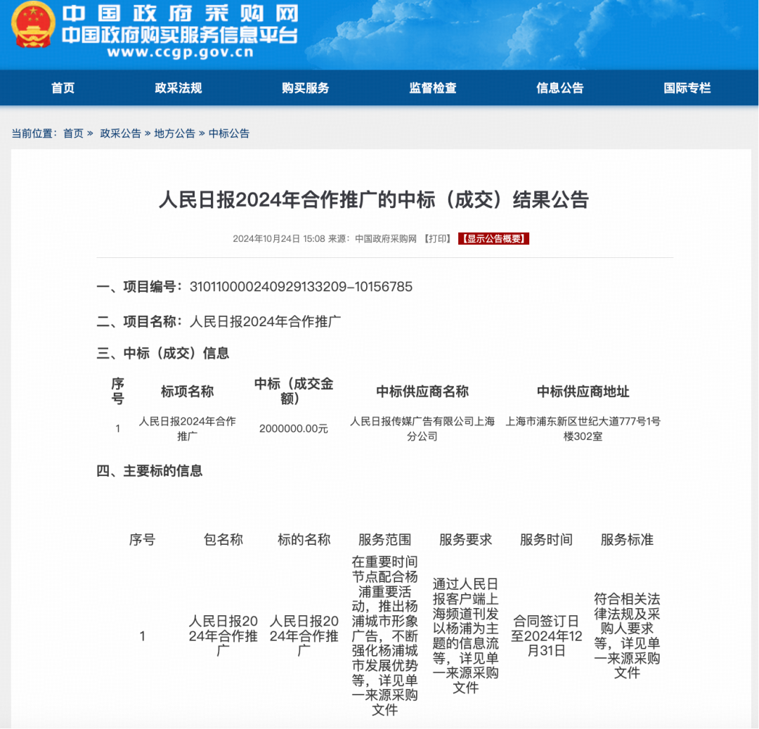 答案是可以。在“中国政务采购网”就可以查询到2024年上海杨浦与《人民日报》合作推广的中标(成交)结果公告,“通过人民日报客户端上海频道刊发以杨浦为主题的信息流等”,金额达到200万。2025年5月,《人民日报》以《两个“五分之一”背后的转型之路》为标题,重磅报道杨浦新旧动能转换。