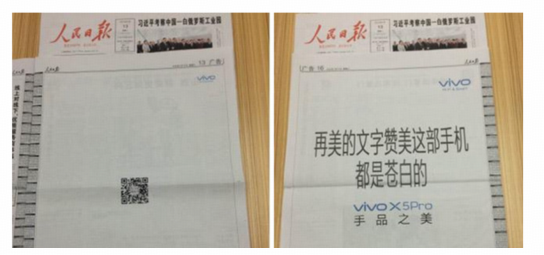 2015年,某手机广告还曾在《人民日报》做了一期广告,4个版面开天窗,只印有一个二维码,非常有创意。广告行业人士分析,当时《人民日报》每个版面的广告费是28万,这四个二维码,花了112万。由于纸媒的影响力逐渐下降,十年来,按照坊间传闻,《人民日报》的广告费并没有大幅度上升,一个版面只比十年前多了2万。