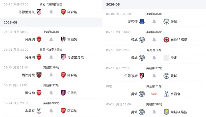 本赛季英超收官前,曼城和阿森纳在各项赛事都还有6场比赛。英超方面,曼城还剩5场比赛(3主2客),阿森纳还剩4场比赛(2主2客),两队都要对阵水晶宫,曼城的5个对手的英超排名普遍在上半区,阿森纳的剩余对手的英超排名则普遍在下半区。