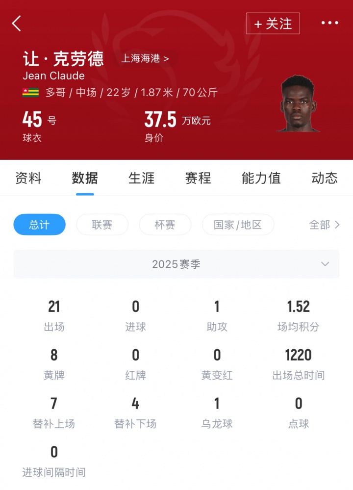 让·克劳德2025赛季效力于横滨水手,出战21场,贡献1助攻。球员目前身价37.5万欧。