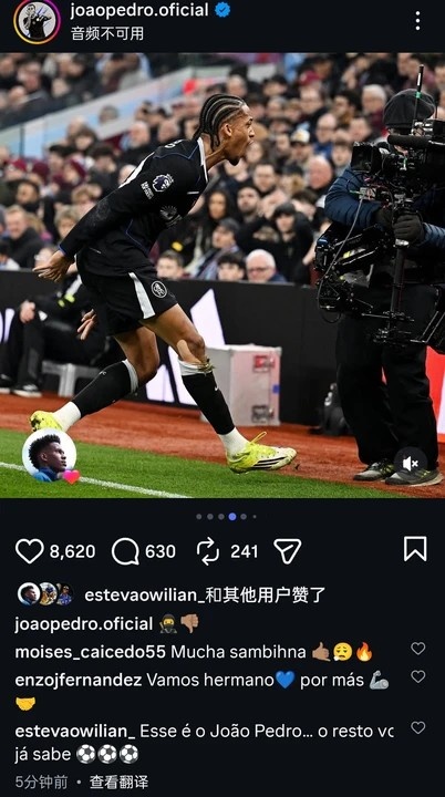 上演帽子戏法的若昂·佩德罗社媒晒照,恩佐、凯塞多等众队友点赞 xiaoqiao 2026-03-07 英超 16 0 3月5日讯 在本轮英超,切尔西4-1大胜维拉。本场比赛若昂·佩德罗贡献3射1传,赛后他也在个人社媒晒出庆祝进球照片,恩佐、凯塞多、埃斯特旺等诸位队友都为其点赞评论,其中恩佐写道:“加油兄弟,进球越来越多!”