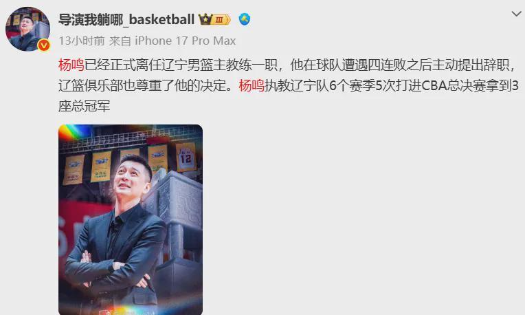 紧接着国内知名媒体人表示杨鸣没有跟随辽宁队,准备与四川队的客场比赛。